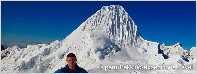 About Alpamayo Peak: The pyramid shaped Alpamayo is considered one of the most beautiful mountains in the world. The ascent toward the peak is very steep and the majority of it is a technical climb. This mountain should only be attempted by those who are well acclimatized and who have summited of other high peaks. From one side Alpamayo is an almost perfect pyramid, covered with enormous ice shelves. The other face, the trapezoidal southwest wall, is even more beautiful. All of the Cordillera Blanca mountain range is protected by Huascarán National Park, a paradise of snowcapped peaks. The park also includes the peaks of Huandoy and Huascarán (the highest mountain in Peru), as well as 663 glaciers, 269 lakes, some 42 rivers, as well as 33 archaeological sites.