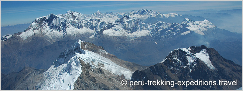 Now the last and best mountain - the highest mountain in Peru, Huascarán. Transfer from Huaraz through the Callejón de Huaylas, the central section of the valley formed by the Santa River between the Cordillera Blanca and the Cordillera Negra. We arrive at the village of Musho, and load our luggage onto burros. From Musho it is a 4-5 hour hike to Huascarán Base Camp (4,250 m), from which we have a beautiful view of the Cordillera Negra.
